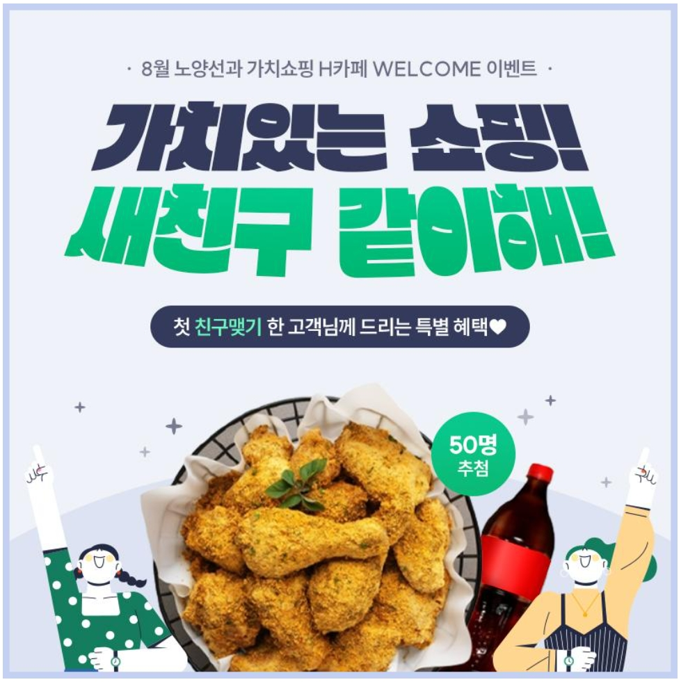 노양선의 가치쇼핑 H카페와 새 친구맺기를 한 고객으로 참여가 한정됩니다. 치킨 기프티콘의 구체적인 종류는 나와있지 않네요. 댓글 참여자가 적으니 대상 해당되시는 분은 꼭 참여하세요.