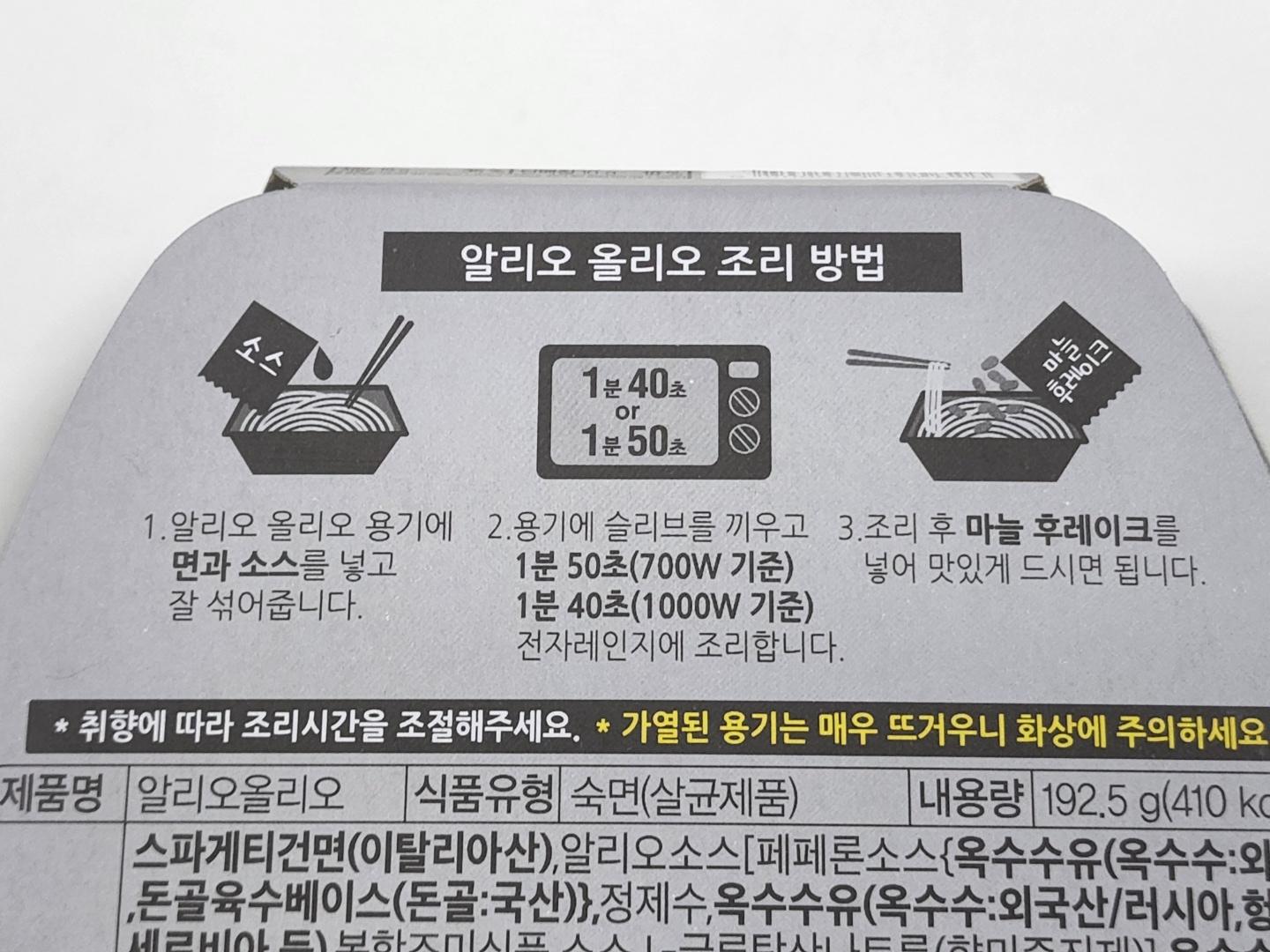 제품명이 한글로는 '알리오 올리오' 라고 되어 있는데 영문으로는 조그맣게 'Alio olio pasta' 라고 적혀 있어요. 뜻을 풀어보면, '알리오'는 이탈리아 말로 '마늘'을 뜻합니다. '올리오'는 '올리브유'를 말해요. 그러니까 '마늘과 올리브유로 만든 파스타' 요리라는 뜻이 되는 거죠.