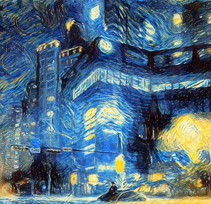 심지어 푸르스름하고 창백한 빌딩 조명에 영감을 받은 한 누리꾼은 빈센트 반 고흐의 '별이 빛나는 밤'에 화풍을 접목하여 현대 미술의 창조해냅니다.