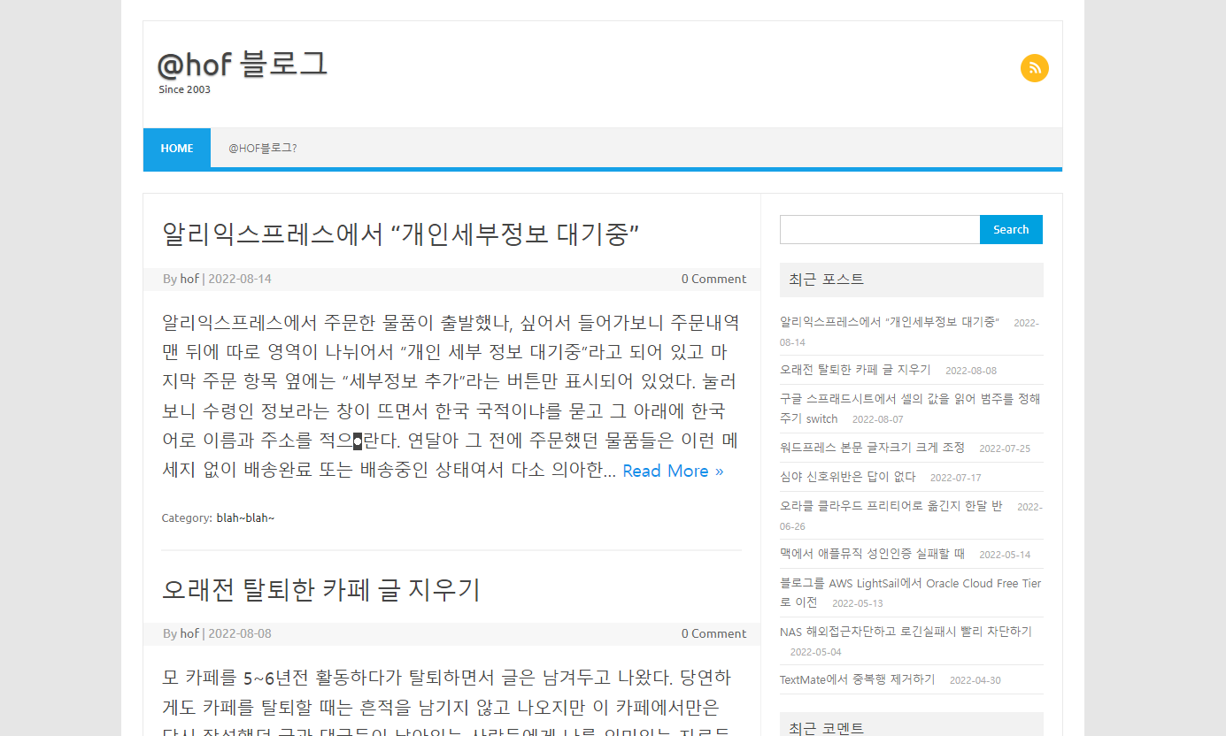 2000년대 초반에 자주 들러 글을 많이 읽었던 hof 블로그가 아직도 살아 있는 것을 발견했습니다. 당시 블로그 중 도메인까지 포함해서 그대로 현존하는 블로그는 규항넷과 hof 블로그 이 두 곳뿐입니다. 반갑네요. ^ㅅ^