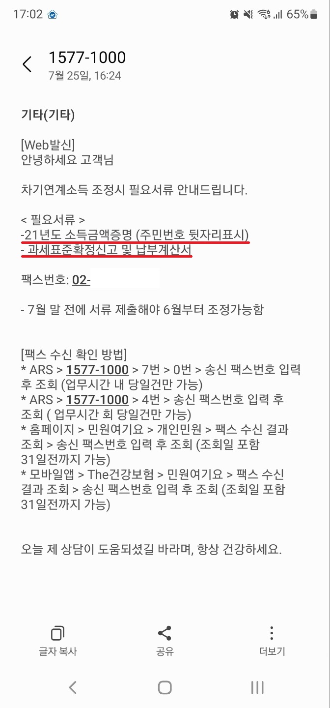 '소득이 감소해서 건강보험료 조정신청하려고 한다'고 말씀하시면, 필요한 서류(위 2가지 서류)와 팩스번호를 불러줍니다. 혹시 까먹으셨어도 문자로도 내용을 보내주니까 안심하세요. ^ㅅ^