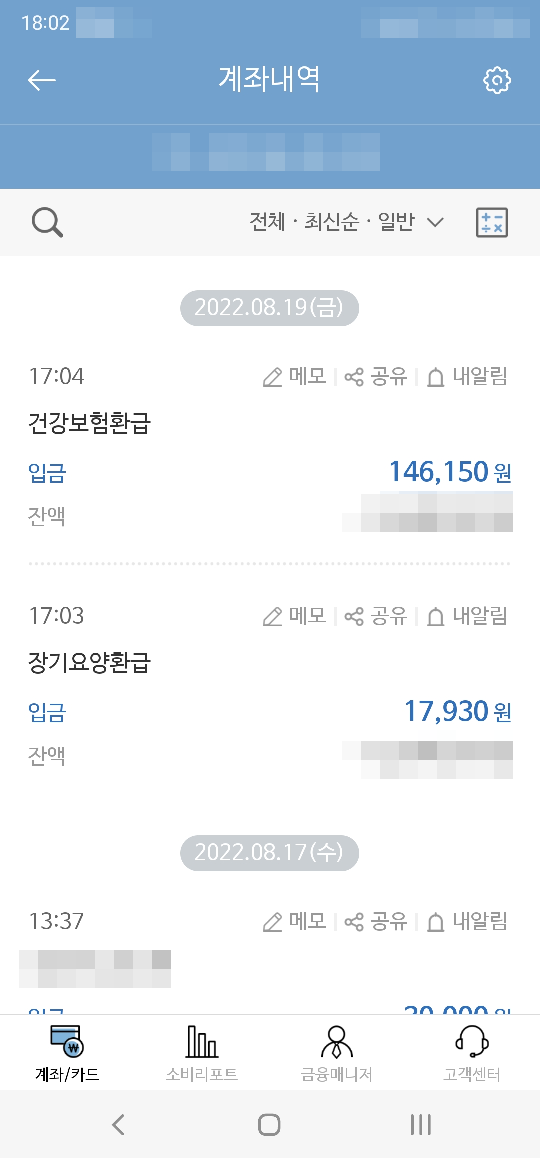 - 8월 10일에 7월분 보험료가 출금(납부)