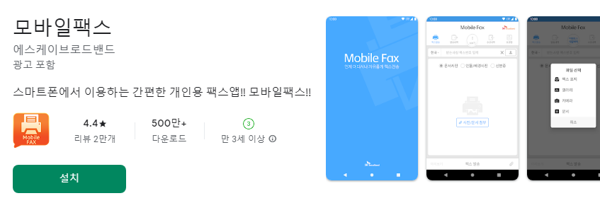 팩스 앱을 보내시는 분은 주의할 점이 있어요!!! 가장 많이 쓰시는 앱이 SK브로드밴드에서 제공하는 '모바일팩스' 앱인데요. 무료라서 많이들 사용하시더라구요. 1페이지 보낼 때마다 문자 1건이 차감된다고 하는데 어차피 요새는 문자가 다 무제한이니까...