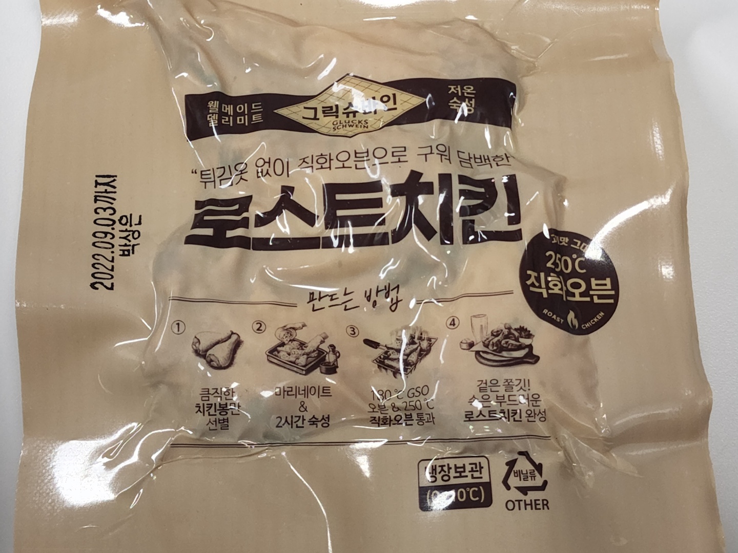 약 6개월 전인 2월 17일에 이 제품 시리즈 중 하나인 '그릭슈바인 로스트치킨 히말라야 소금구이'를 리뷰한 적이 있습니다. 그 사이에 가격은 6,900 원에서 7,900 원으로 올랐는데, 당시 지적했었던 조리법 표기에 대한 부분은 전혀 개선된 게 없네요. 이물질 혼입 우려가 있는데도 겉비닐 포장이 없는 점도 동일합니다.