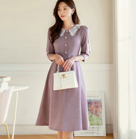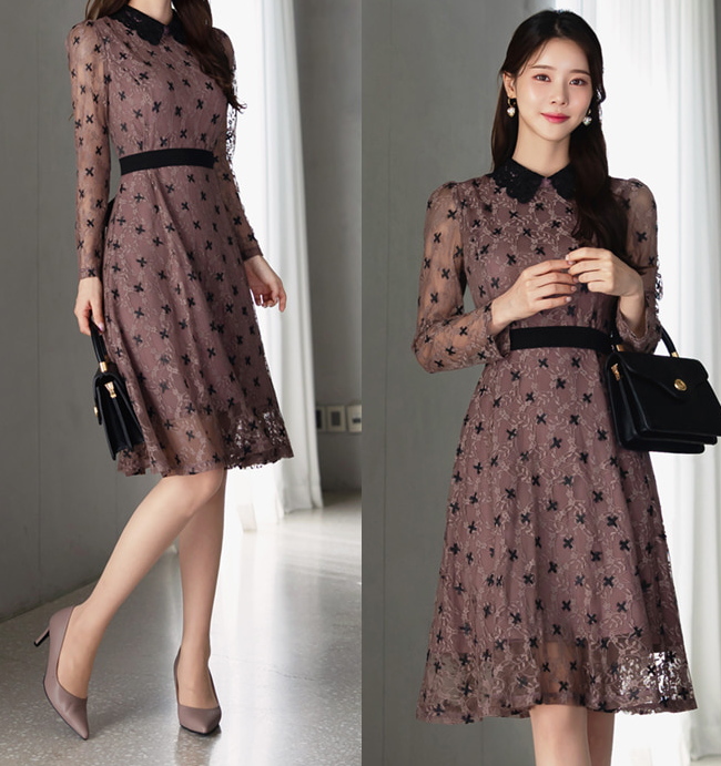 로맨틱한 분위기를 자아내는 아이템무드를 한층 더 살려주는 레이스 배색카라! 은은한 시스루 실루엣까지 매력적인 원피스♡ S,M,L,XL,XXL