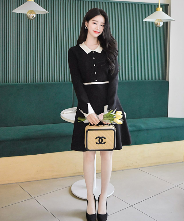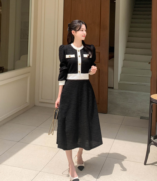 ■ 3. 부클 트위드 원단의 퍼프소매 배색 플레어 롱 원피스 - 39,600 원