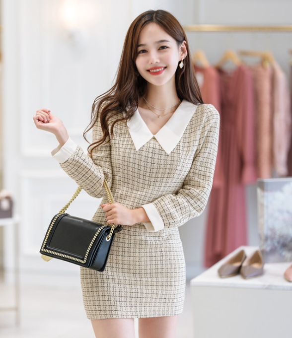 고급스러움 가득한 체크 트위드 패브릭의 카라 배색 슬림 미니 원피스 dress