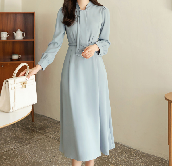 우아한 무드의 롱 플레어 타이넥 디자인분위기있는 블루 컬러와 신비로운 퍼플 컬러 시즌 분위기를 고급스럽게 연출하기 좋아요 S,M,L,XL,XXL