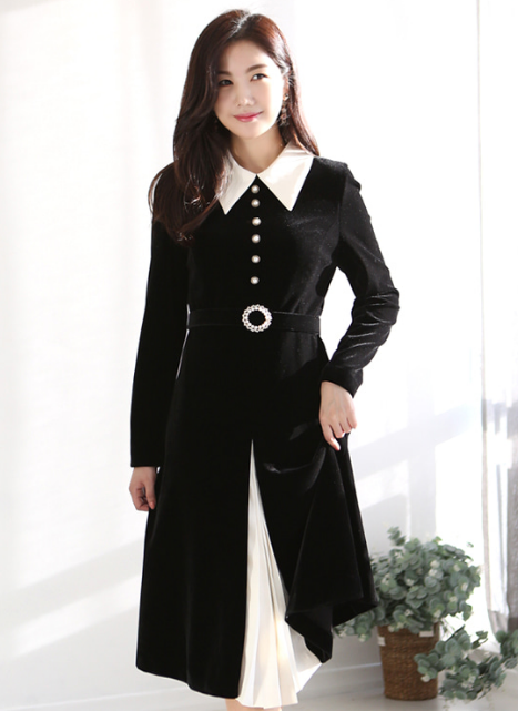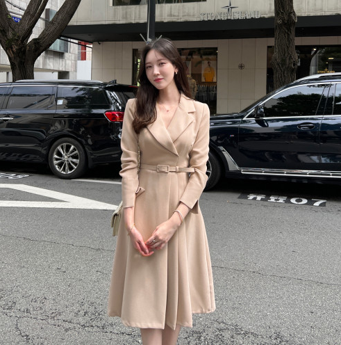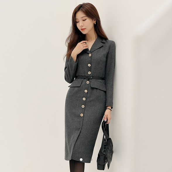 ■ 7. 럭셔리 골딩 버튼 벨티드 카라 원피스 - 69,900 원