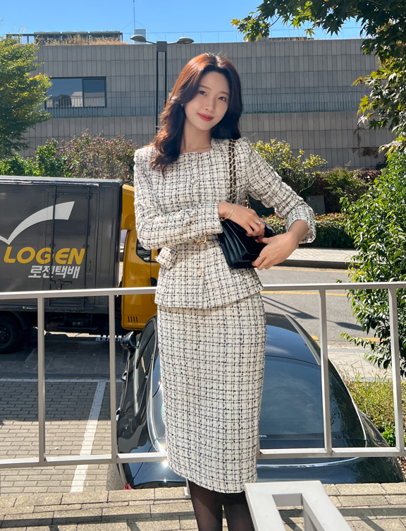 격식 차려줘야 하는 자리에 세트로 고민없이 함께하기 좋은 트위드 자켓&스커트 셋업!