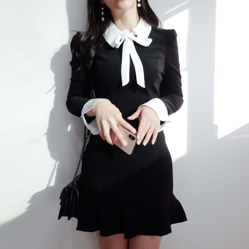 쉬폰카라 스웨이드 리본 슬림핏 프릴 미니 원피스/3color (크리스마스 하객 오피스룩) : 오드리버