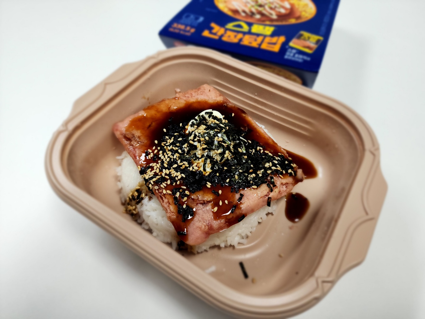 스팸 간장덮밥 기획자 : 밥 위에 스팸을 올리고 뚜껑이나 슬리브를 덮을 필요 없이 그냥 전자렌지에 돌리세요.