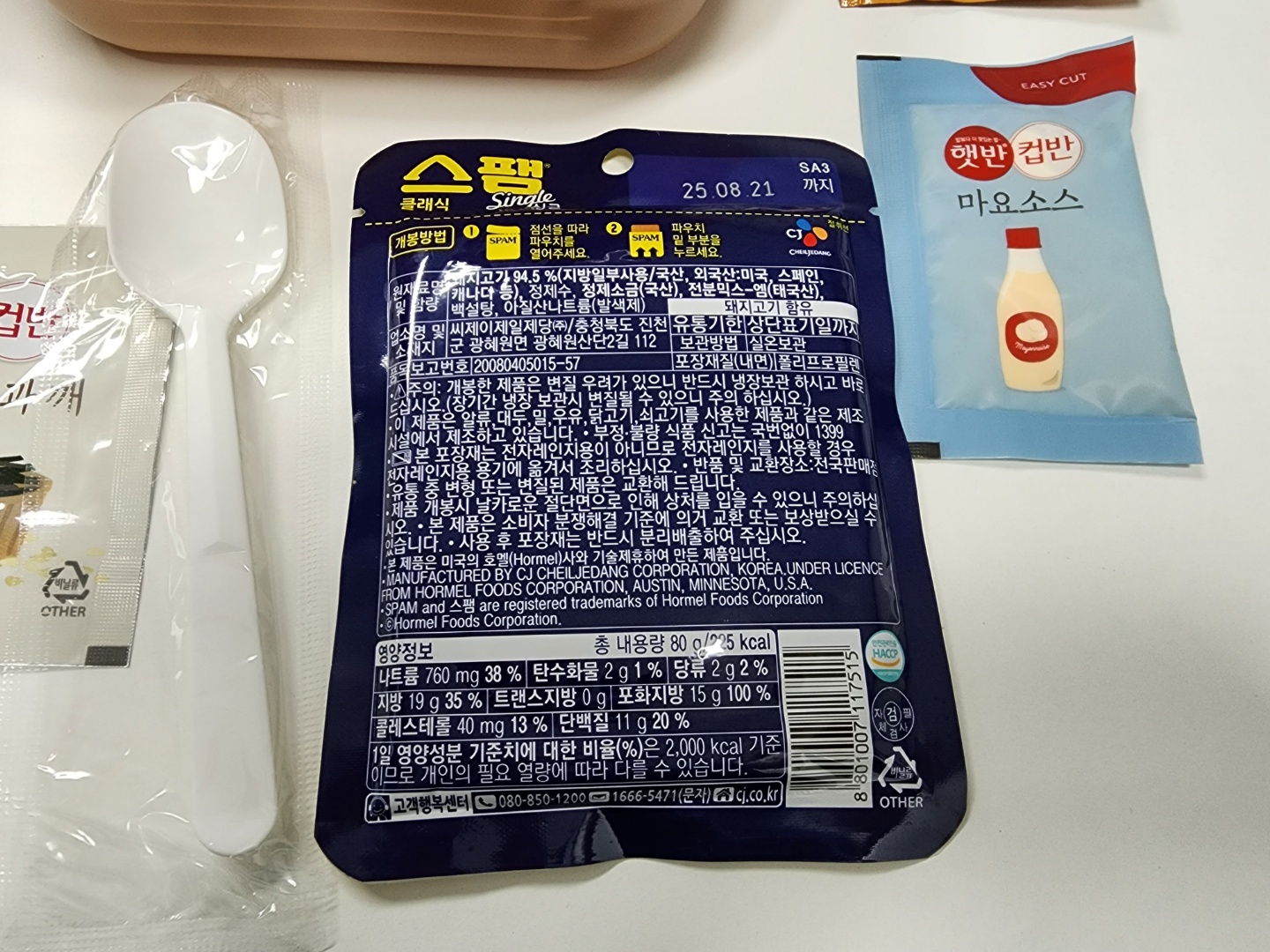 구성품이 거의 비슷합니다. 햇반 + 스팸 + 간장소스 + 마요소스 + 김까지. 차이가 있다면 스팸이 통으로 들어가 있느냐 아니면 잘게 썰어져 있느냐, 그리고 간장소스가 분리되어 있느냐 아니면 스팸과 섞여 있느냐, 이 정도입니다. 실온보관이 가능하다는 점도 동일하고요. 맛은 거의 차이가 없습니다만, '스팸 간장덮밥'은 아무래도 '스팸 싱글클래식'이 통째로 들어가 있다보니, 뭔가 풍성하고 고급스러원 느낌이 더 강합니다. 맛만 놓고서 둘 중에 하나를 고르라면 저는 이쪽을 고르겠어요.
