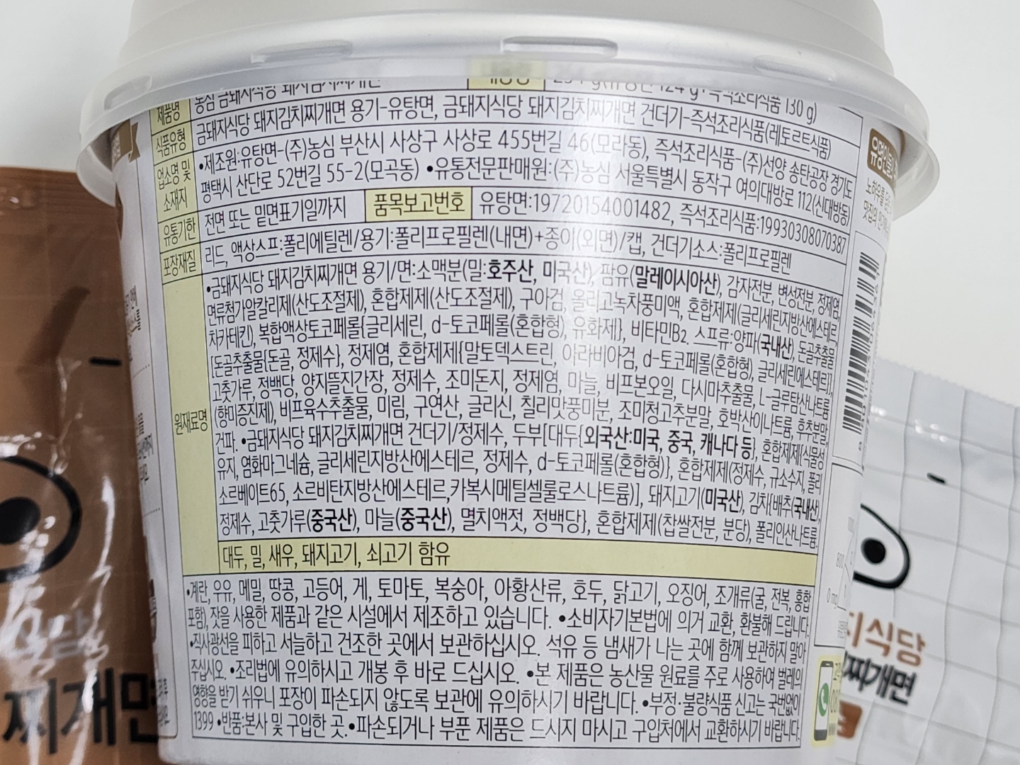 일반적인 컵라면 + 돼지김치찌개 건더기로 구성되어 있습니다. 컵라면 안에는 김치찌개 맛을 내는 국물 소스가 들어 있습니다. 돼지김치찌개 건더기 파우치에는 정말 건더기만 들어 있습니다. (김치, 두부, 돼지고기)