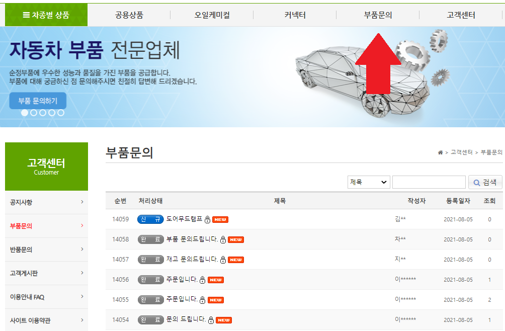 2) 메뉴 중 '부품문의' 게시판으로 들어갑니다.