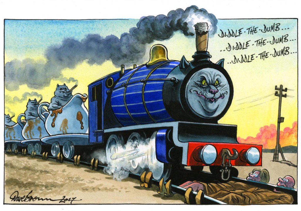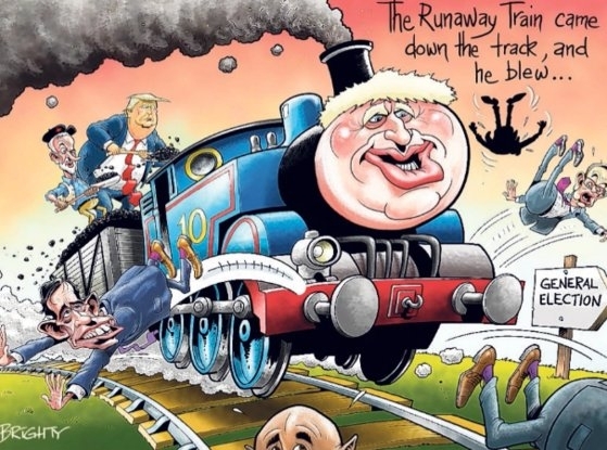 정치인을 질주하는 기관차에 빗대는 것은 정치 풍자에 있어 수많은 클리셰(전형적이고 상투적인 표현 방법) 중 하나에 불과합니다. 예를 들어, 공포영화에서 뭔가 있는 것 같아 주인공이 문이나 창문을 열었을 때 아무도 없었는데, 문을 닫고나니 살인마가 보이는 장면은 수많은 영화에서 반복하여 등장하고 있지만 누구나 표절이라고 하지 않습니다.