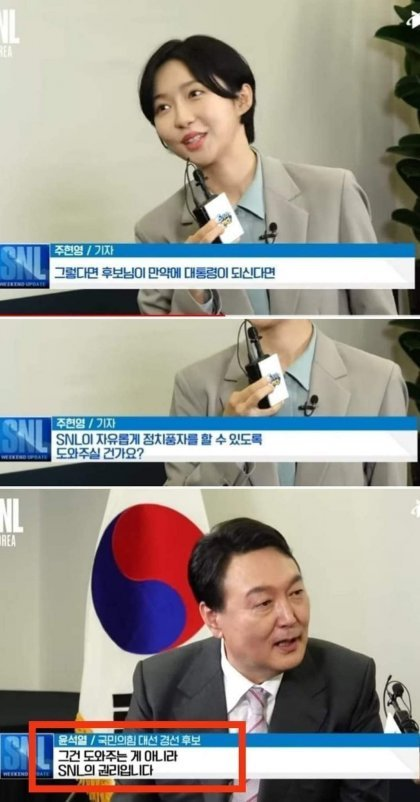 또한 SNL과의 인터뷰에서 윤석열 대통령은 '정치 풍자'는 대통령이 허락해주는 것이 아니라 국민의 당연한 권리라고 말한 바 있습니다.