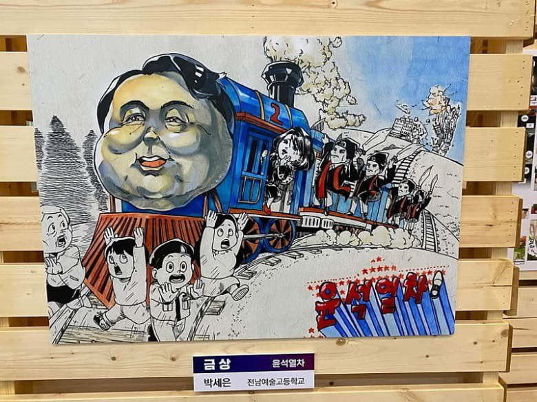 제23회 전국학생만화공모전 카툰 부문에서 윤석열 대통령을 풍자한 고등학생의 그림 ‘윤석열차’가 금상을 수상해 논란이 된 가운데, 온라인상에서 해당 작품이 영국 일간지 정치 풍자 만화를