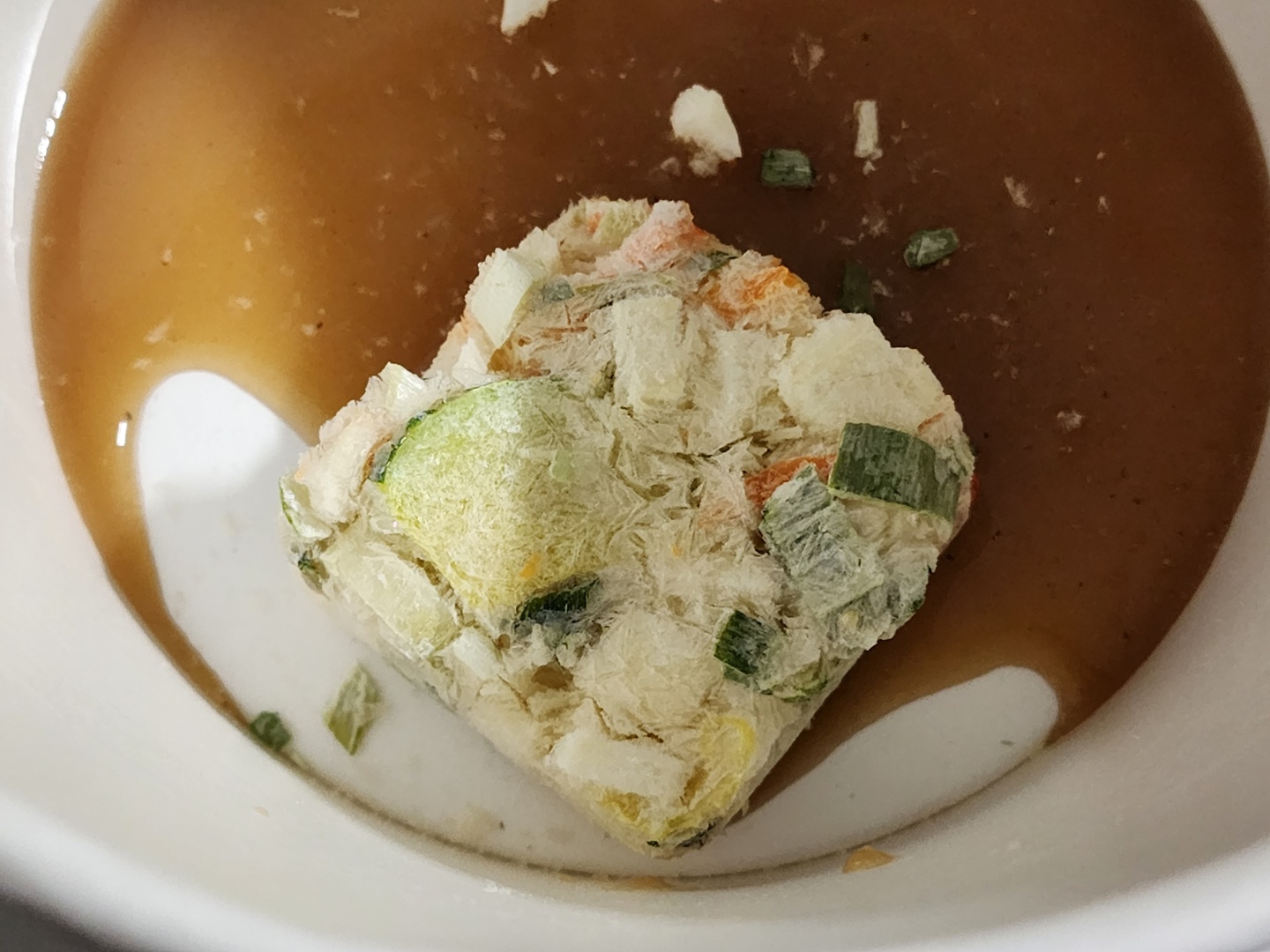 동결건조블록에는 파와 당근 채, 애호박 등이 들어 있습니다. 저렇게 바싹 건조된 걸 보고 있자니, 저 채소에 영양분이라는 게 남아 있을까 하는 생각이 드네요.