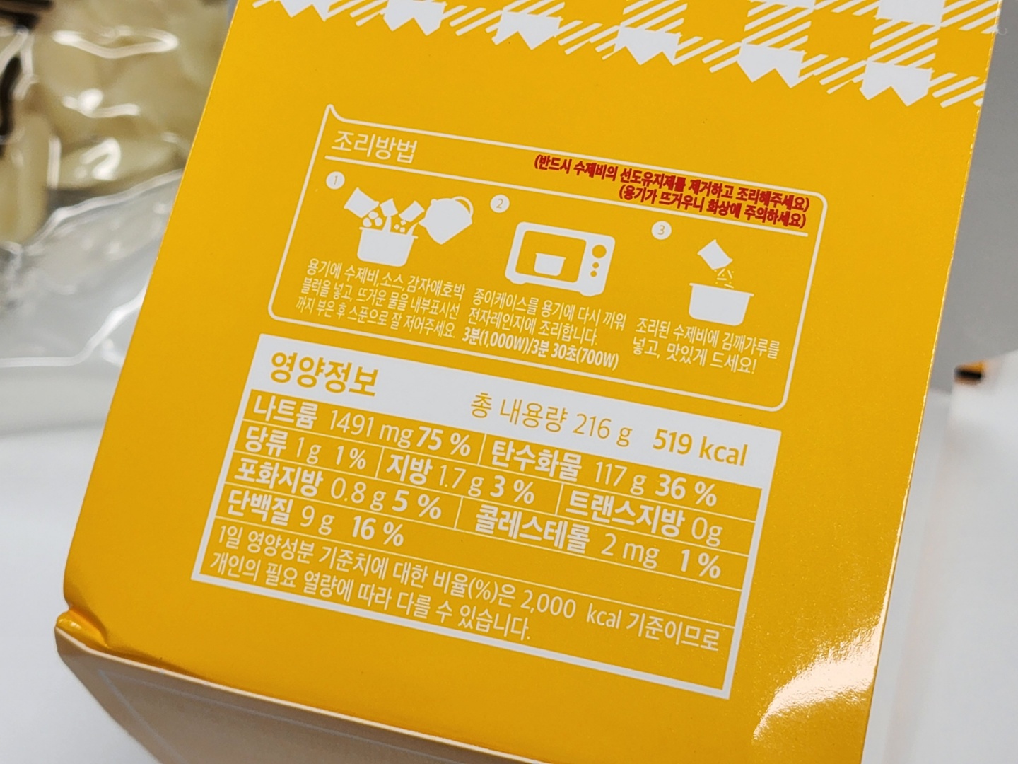 편의점 : GS25 제품명 : 이가자연면 쫀득감자 수제비 중량 : 193 g 영양 정보 : 500 kcal, 나트륨 800 mg 보관 : 냉장보관 가격 : 3,400 원 맛 점수(별 5개 만점) : ★★★ 매운 맛 : 전혀 맵지 않다 / 살짝..