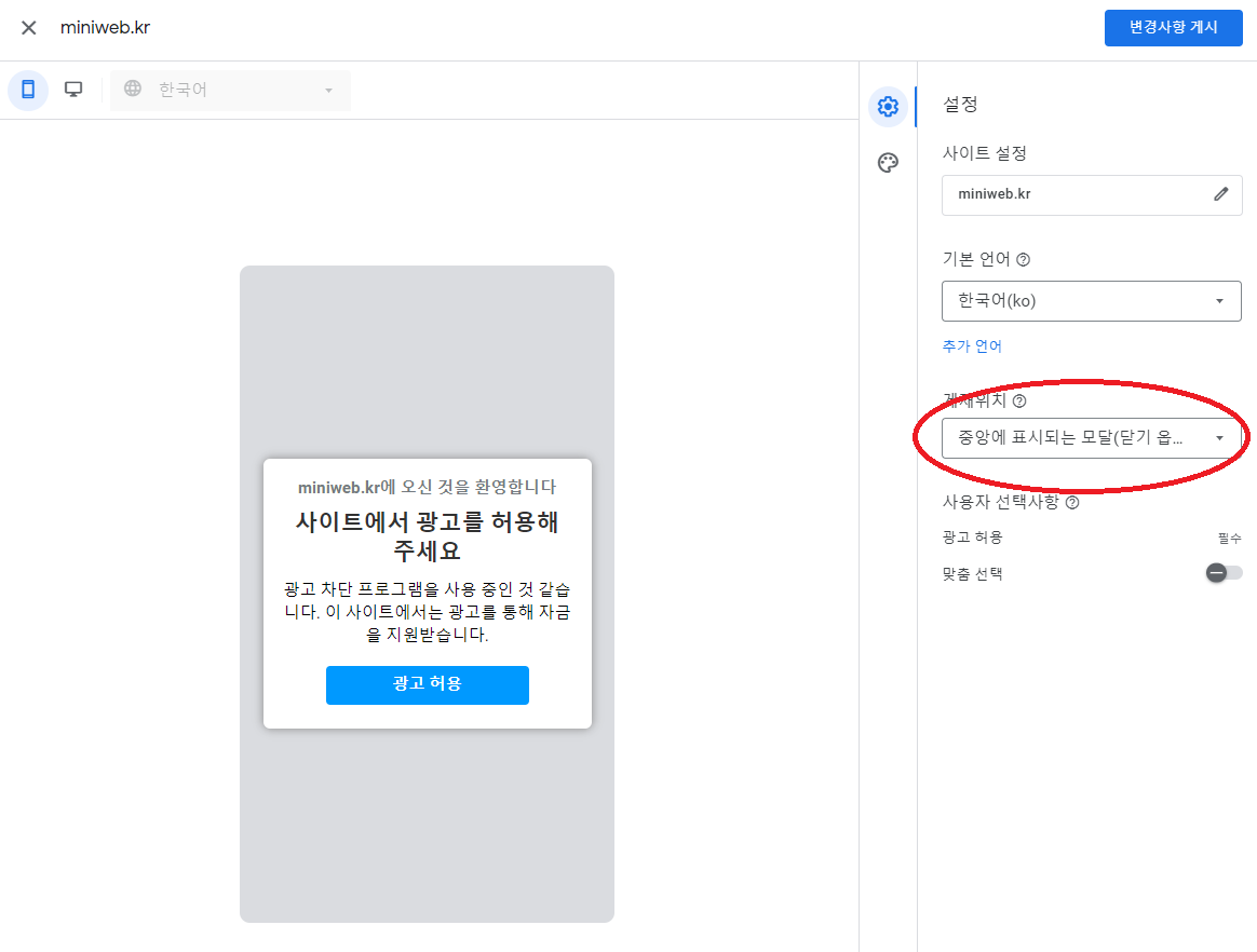 2. 아래 스크린샷과 같이 광고 차단 회복 기능을 활성화시킨 후 '저장하기' 버튼을 누릅니다.