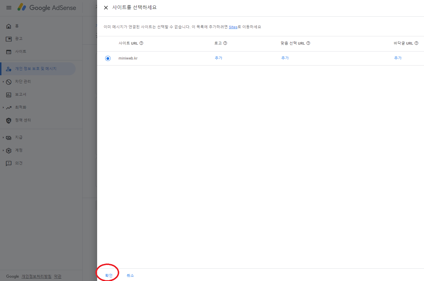 4. '사이트 추가'를 누르고 광고가 메시지를 표시할 사이트를 선택합니다.