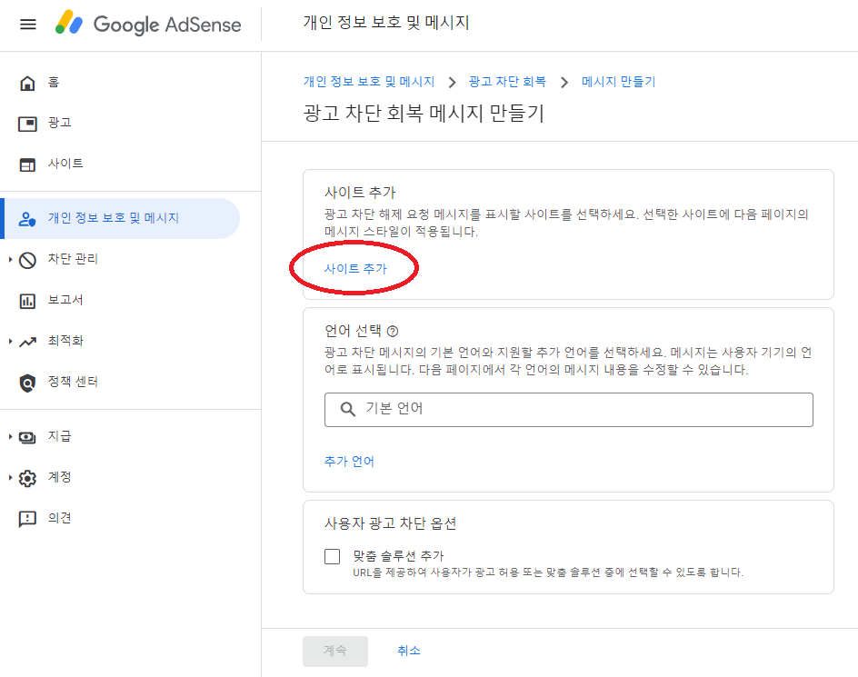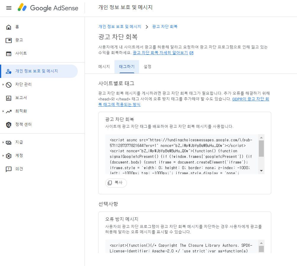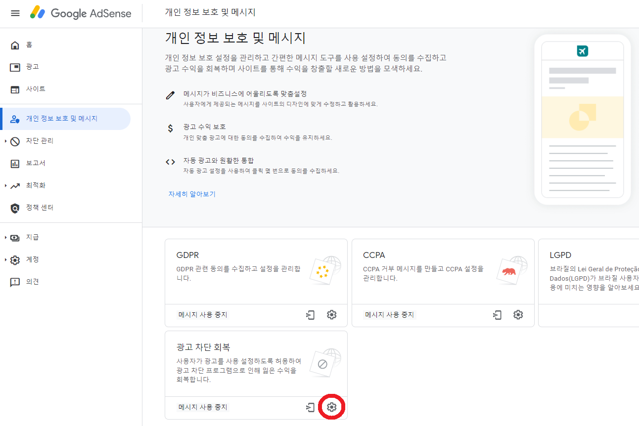 1. 애드센스에 접속하여 '개인 정보 보호 및 메시지' 메뉴 안의 광고 차단 회복 카드의 설정(톱니바퀴) 아이콘을 누릅니다.