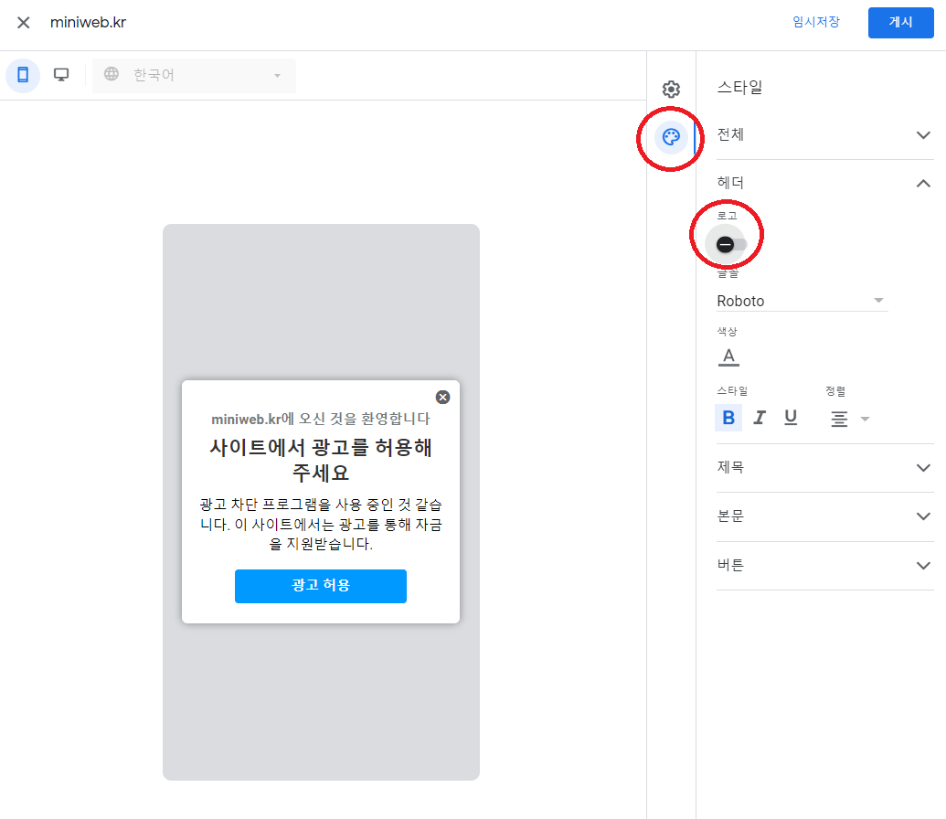 7. 로고를 등록하지 않아 게시가 안되실 겁니다. 로고 없이 게시를 하기 위해 팔레트 모양 아이콘을 누른 후, 로고 토글 버튼을 해제합니다. 그러고 나서 '게시' 버튼을 누릅니다.