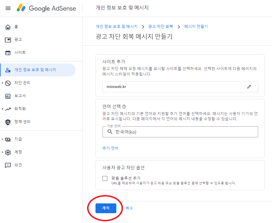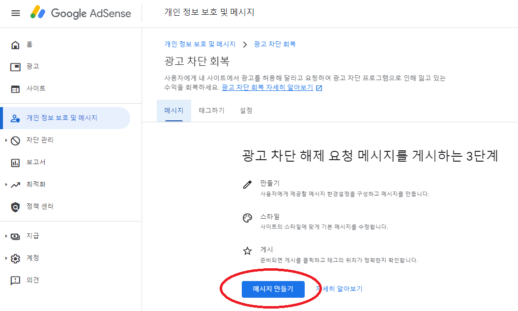 1. 애드센스에 접속하여 '개인 정보 보호 및 메시지' 메뉴 안의 광고 차단 회복 카드의 설정(톱니바퀴) 아이콘을 누릅니다.