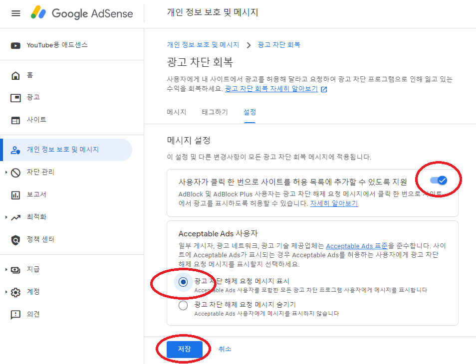 2. 아래 스크린샷과 같이 광고 차단 회복 기능을 활성화시킨 후 '저장하기' 버튼을 누릅니다.