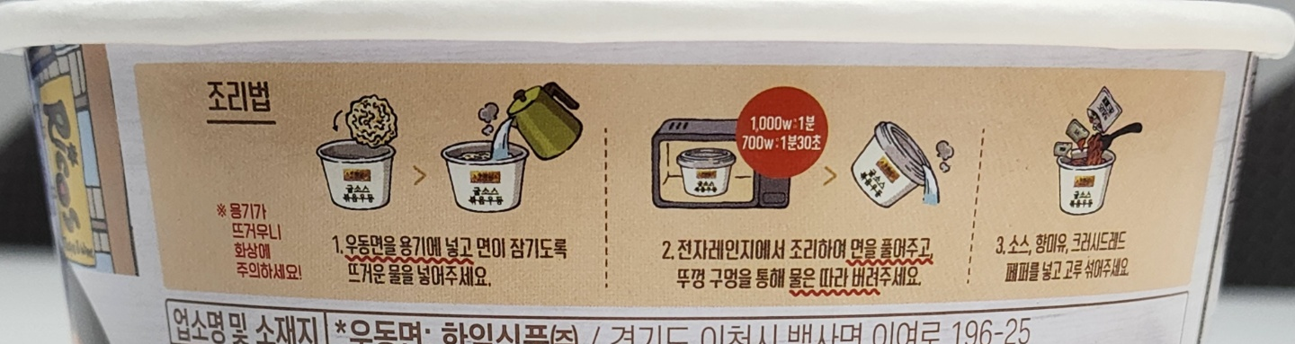 - 우동면을 용기에 넣고 면이 잠기도록 뜨거운 물을 넣어주세요.