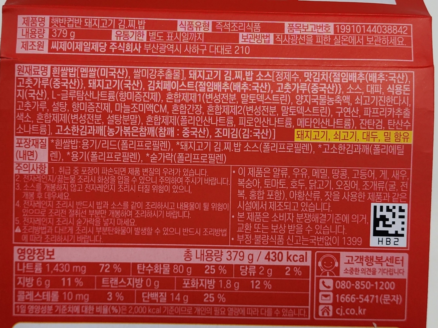 제품명 : 햇반컵반 돼지고기 김찌밥