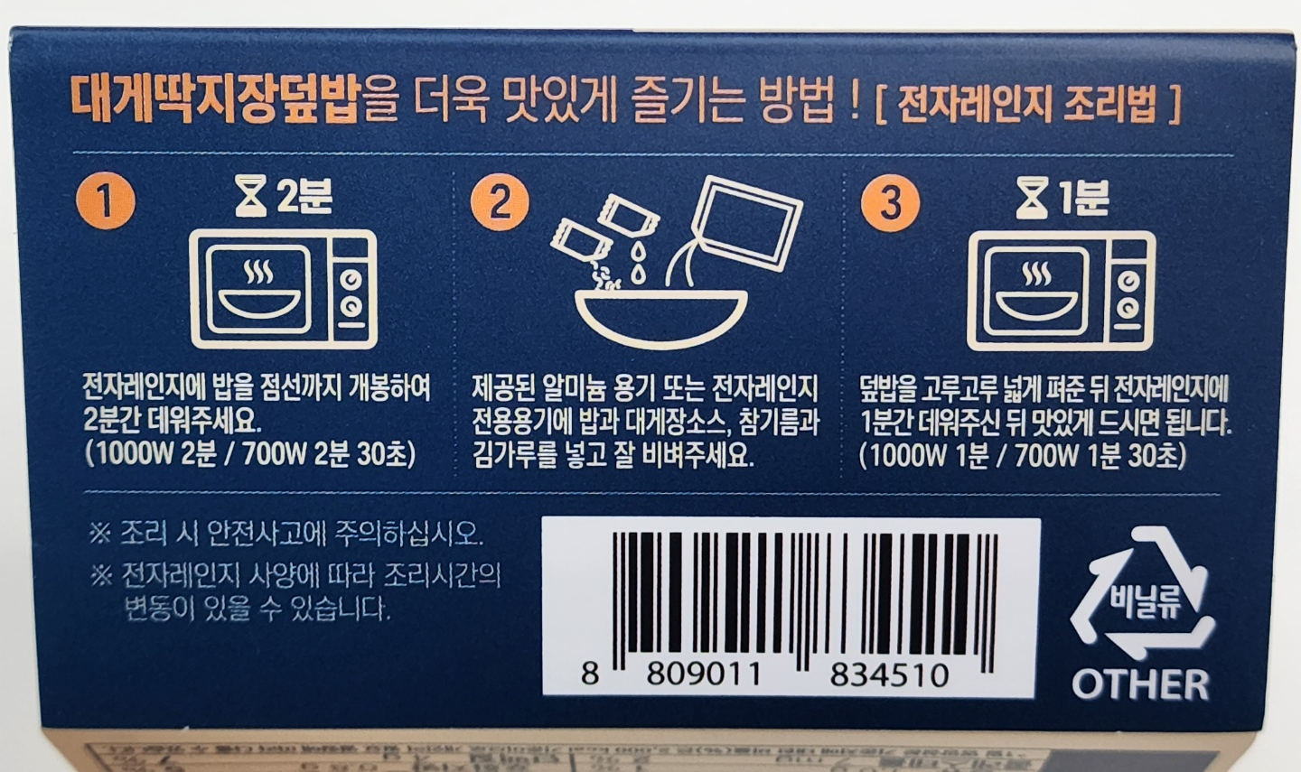GS25 대게딱지장 덮밥은 저의 개선된 조리법과 마찬가지로 밥을 먼저 조리하라고 되어 있습니다. 소비자의 말을 귀담아 들은 건지, 연구진들이 고민해서 정한 조리법인지는 모르겠지만, 분명한 건 CU 직원(혹은 동원홈푸드)들이 생각이 없었다는 건 확실히 증명이 되었네요. CU는 언제 조리법 수정하는지 한 번 보겠습니다.