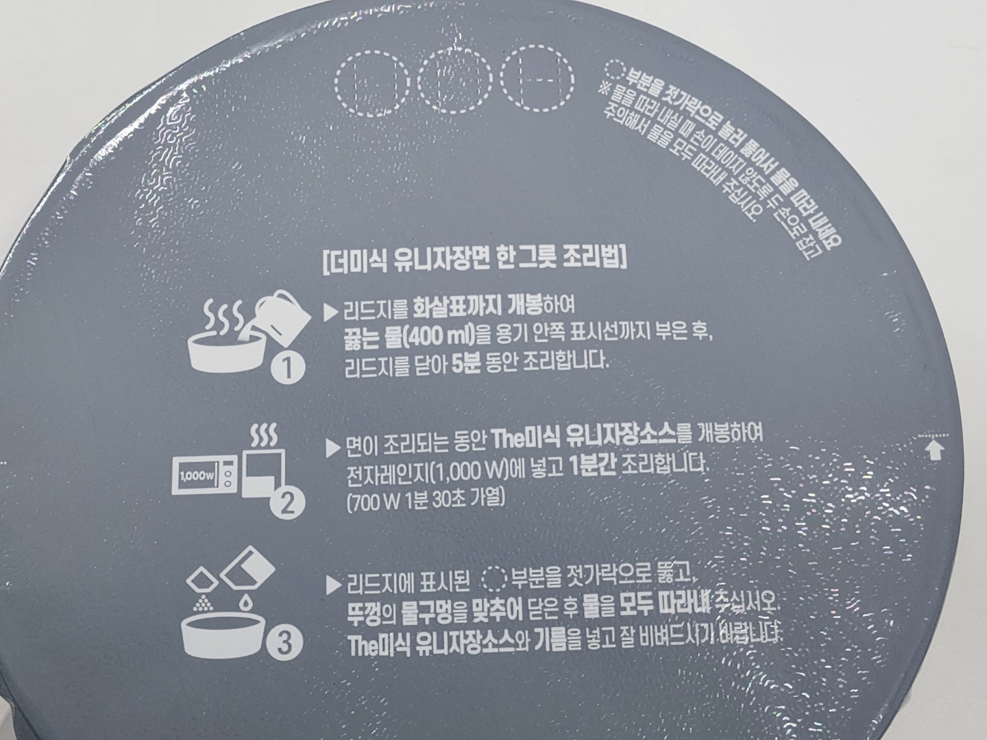 - 리드지에 표시된 점선 구멍 부분을 젓가락으로 뚫고, 뚜껑의 물구멍을 맞추어 닫은 후 물을 모두 따라내 주십시오. The미식 유니짜장소스와 기름을 넣고 잘 비벼드시기 바랍니다.