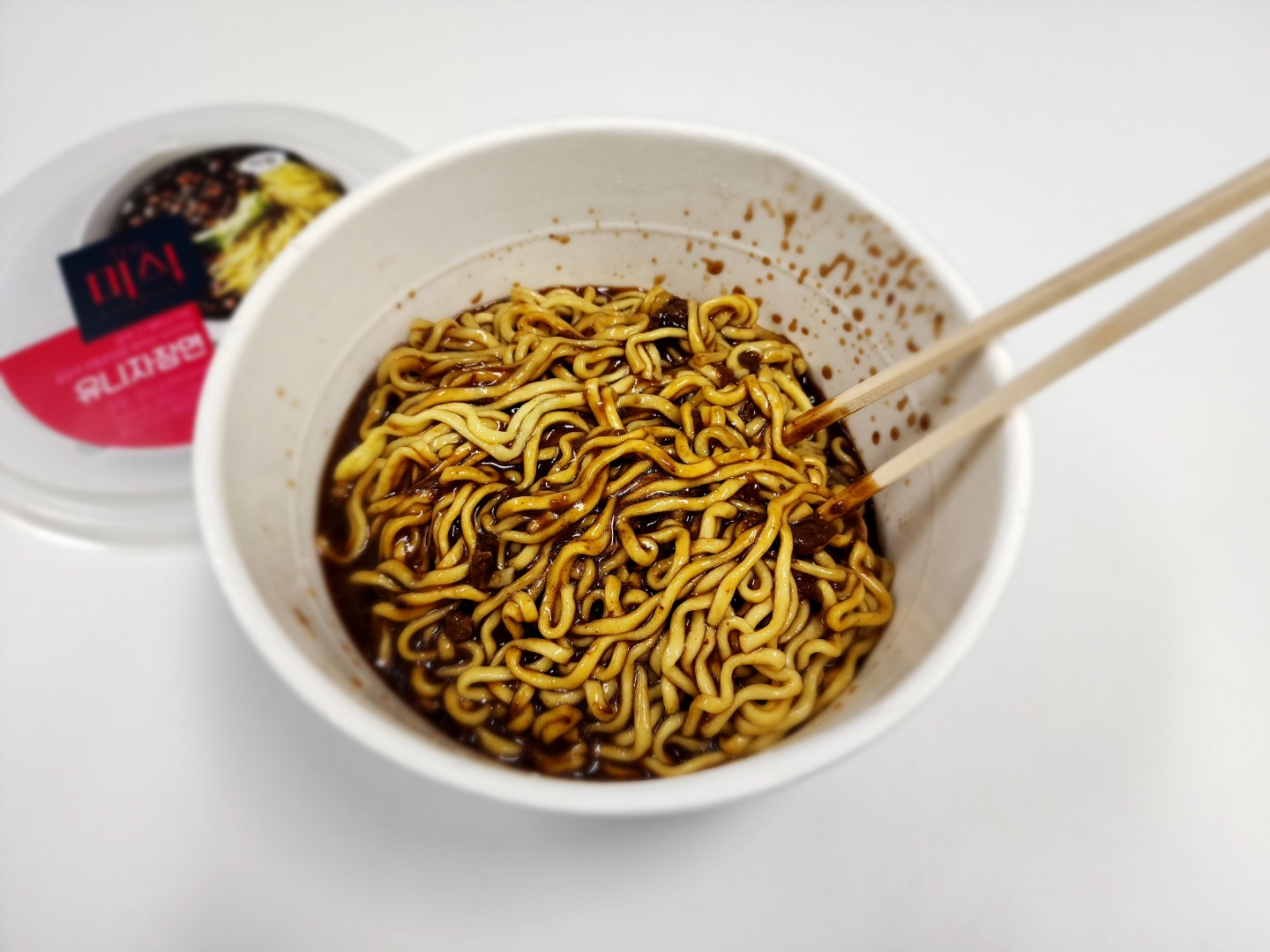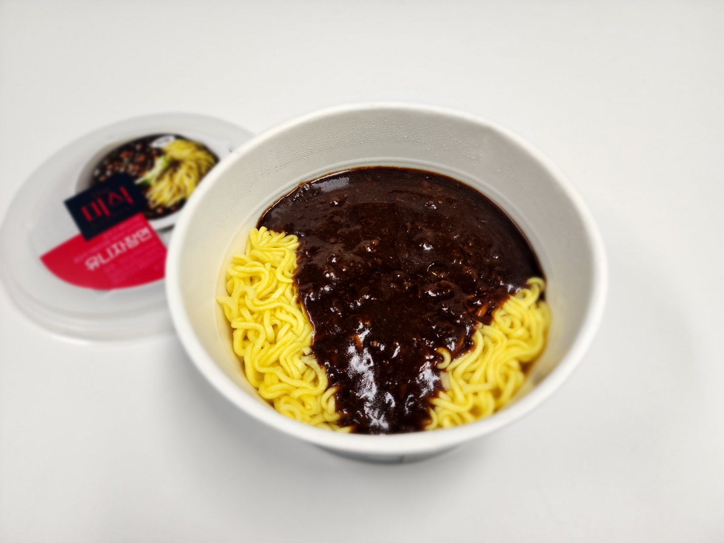 아래 사진은 소스를 붓고 섞지 않은 상태의 제품과 섞은 후의 제품 사진입니다. 섞은 사진을 보시면 그냥 평범한 짜파게티 큰사발과 분간이 안 갑니다. 유탕 건조면에 뜨거운 물을 넣는 평범하고도 보급형 스러운 제품 제조 공정을 선택한 어쩔 수 없는 결과로 보이는데요. 4,980 원이라는 가격의 제품에서 저런 유탕 건조면을 사용해야 했는지 의문입니다. 평범한 생면 쓰면 훨씬 평가가 좋았을 텐데요.
