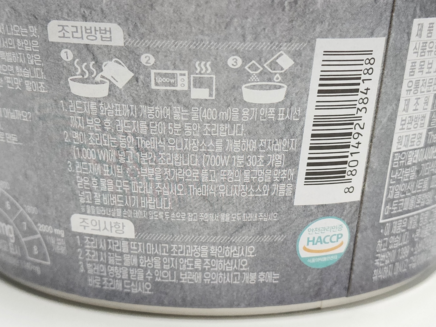 제품 조리법을 행여라도 잃어버릴까봐 걱정이 됐는지, 이 제품에는 조리법이 3 군데에 적혀 있습니다. (1) 제품 겉뚜껑 커버, (2) 제품 속 커버 (3) 용기 옆면..... 정말 과도한 친절이 아닐 수 없습니다. 혓바닥이 길어도 너무 긴듯....