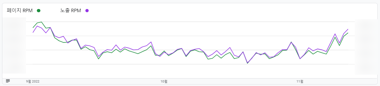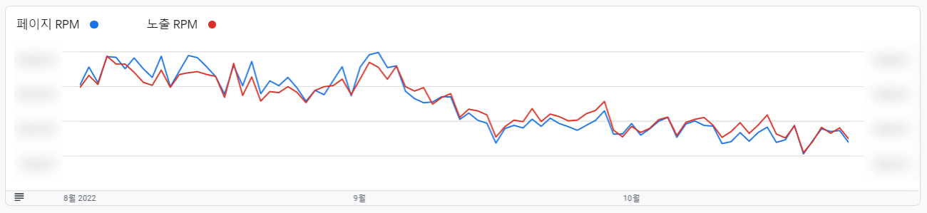 그런데 제가 말씀드리고 싶었던 것은 위에서 얘기한 '티스토리의 문제'가 아니라 구글 애드센스의 문제입니다. 티스토리 블로그의 크롤링 오류도 없고 광고 게재비율도 문제가 없는 상태에서 미니웹 수익이 대폭 하락했던 것은 CPC(광고 단가)와 CTR(광고 클릭률)의 동반하락, 즉 RPM의 감소 때문이었습니다.