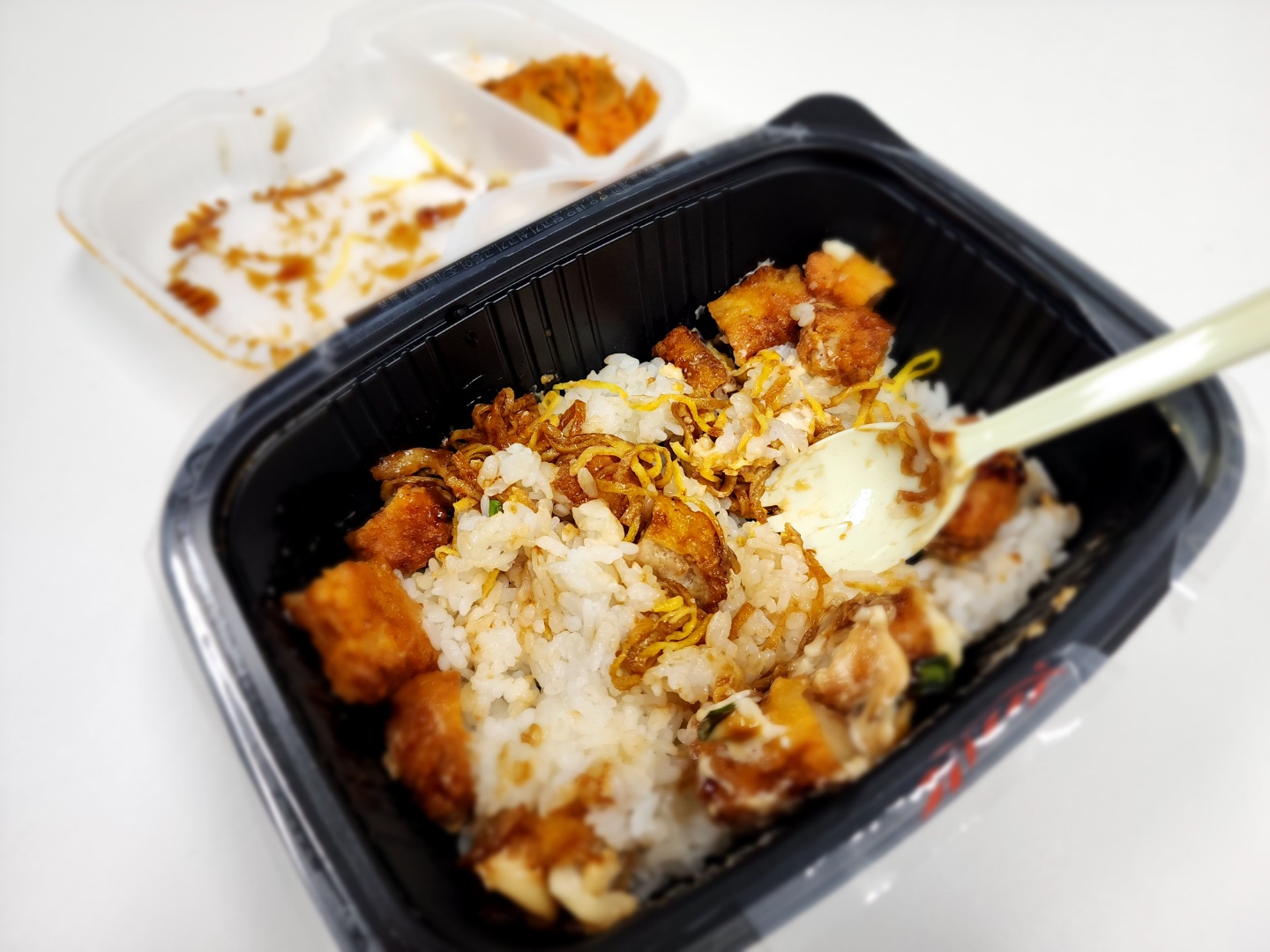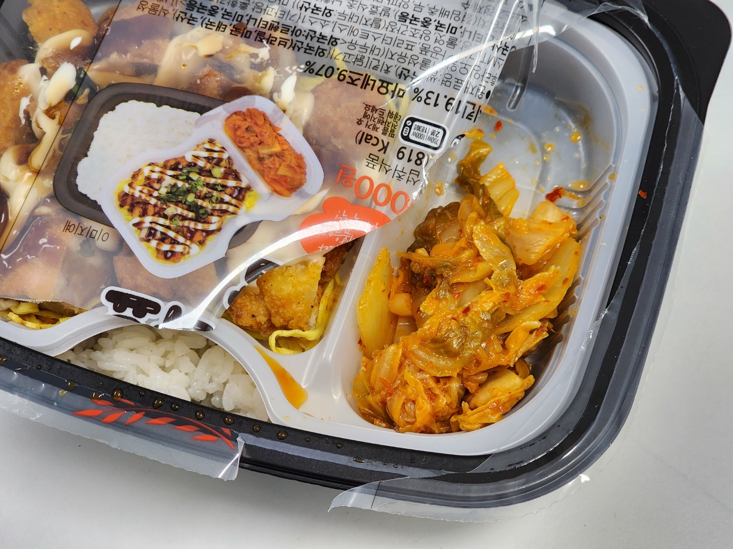 필름을 뜯으면 내부에 별도 용기가 있고, 그 안에 치킨마요 토핑과 볶음 김치가 들어 있습니다. 그리고 내부 용기를 꺼내면 맨 밑에 흰 쌀밥이 나옵니다.