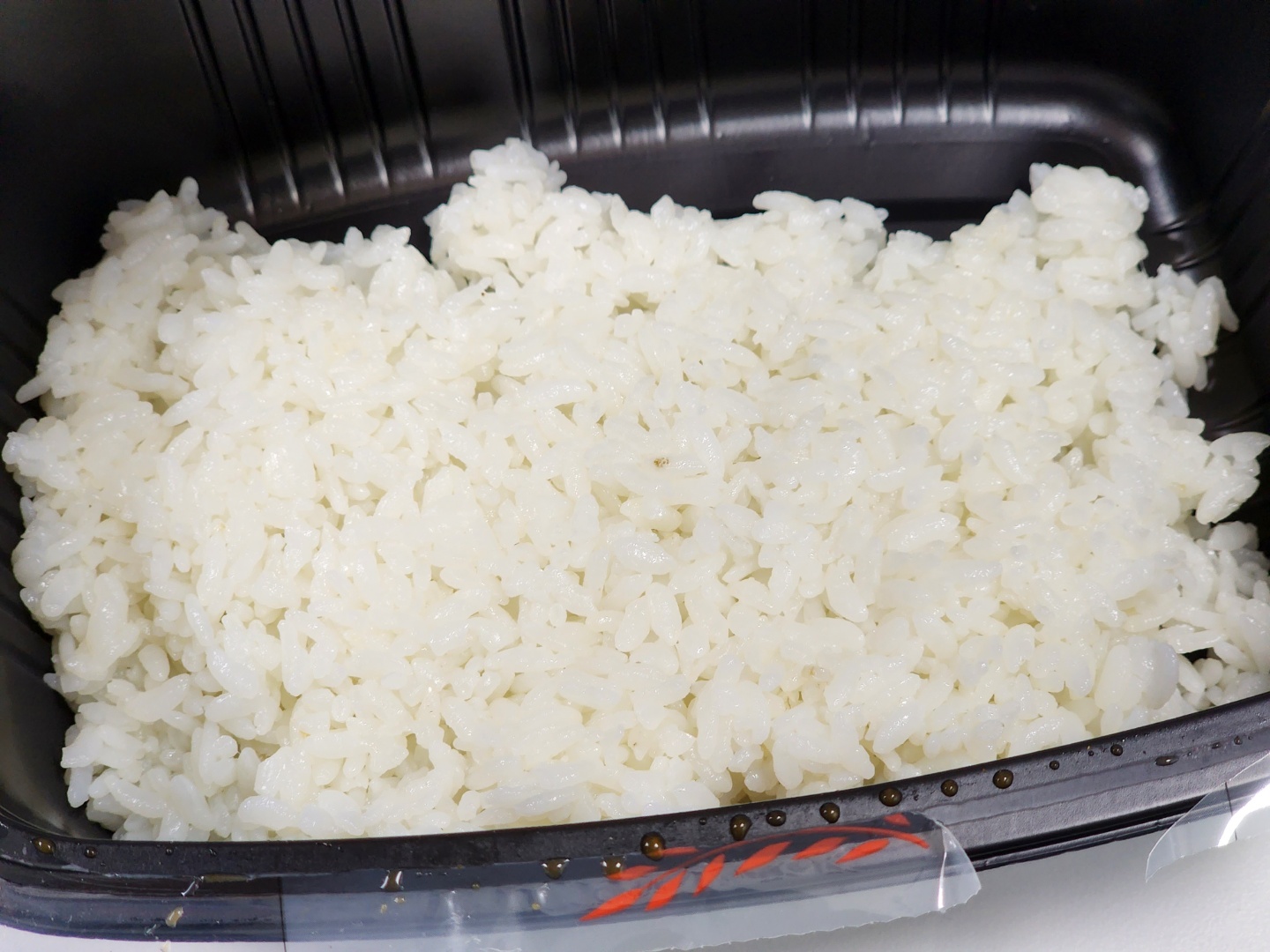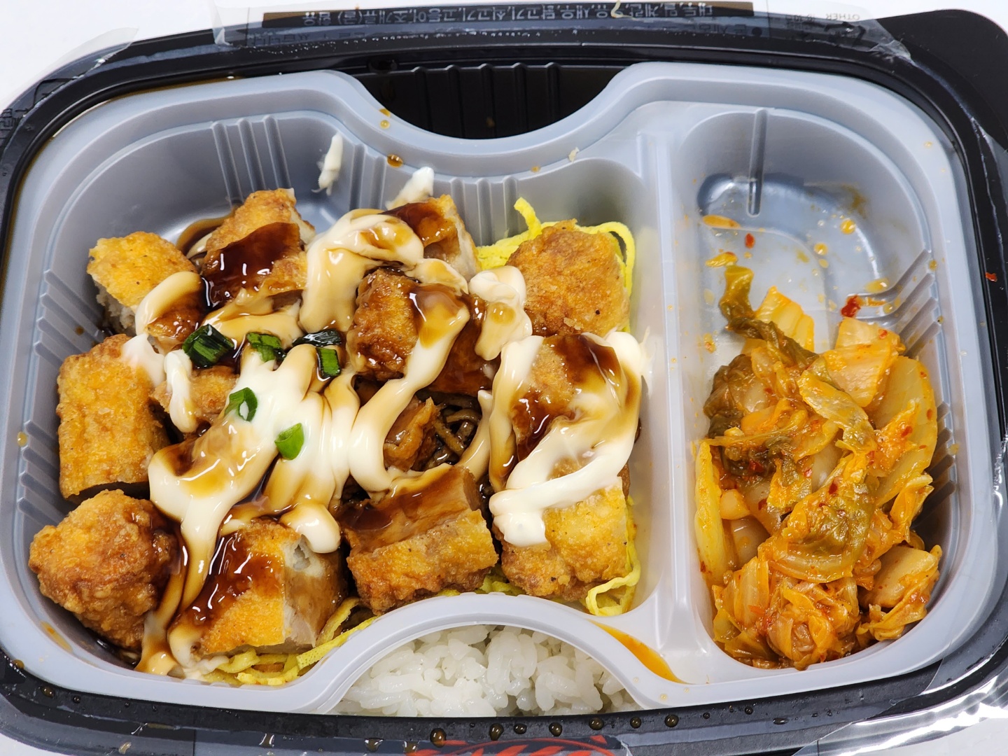 필름을 뜯으면 내부에 별도 용기가 있고, 그 안에 치킨마요 토핑과 볶음 김치가 들어 있습니다. 그리고 내부 용기를 꺼내면 맨 밑에 흰 쌀밥이 나옵니다.
