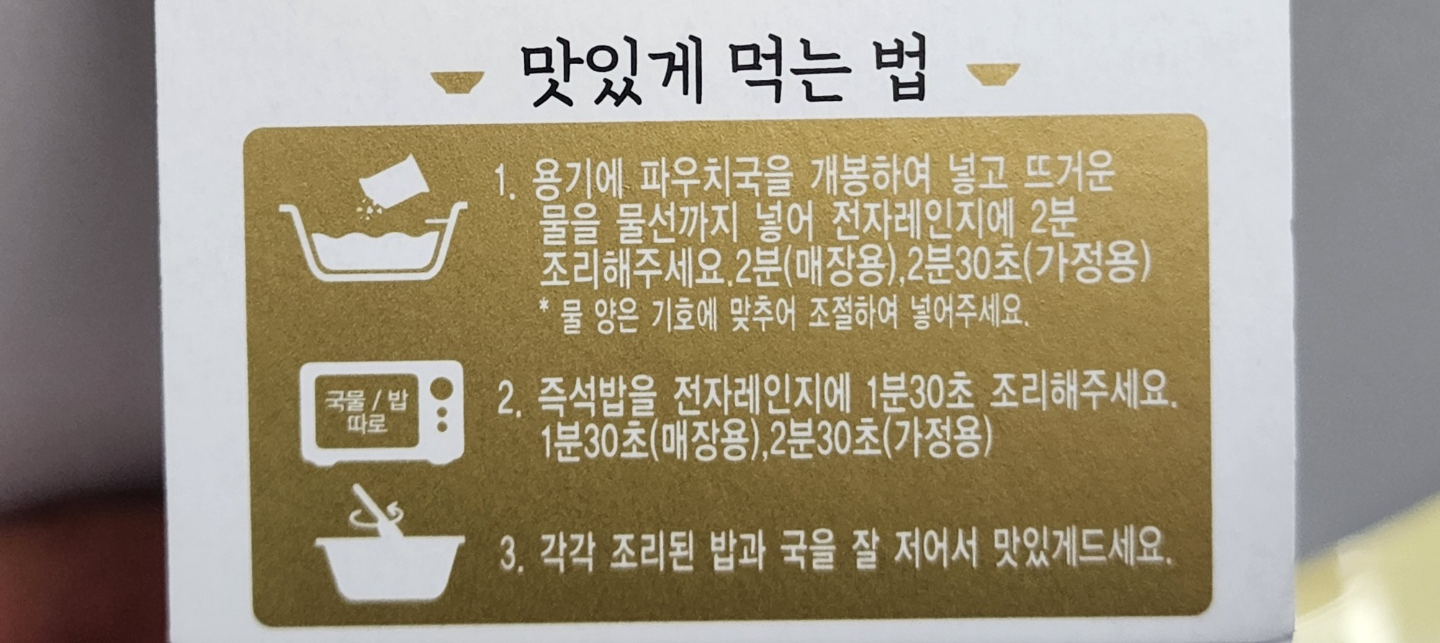 - 용기에 파우치국을 개봉하여 넣고 뜨거운 물을 물선까지 넣어 전자레인지에 2분 조리해주세요. (2분 : 매장용 / 2분30초 : 가정용) *물 양은 기호에 맞추어 조절하여 넣어주세요.