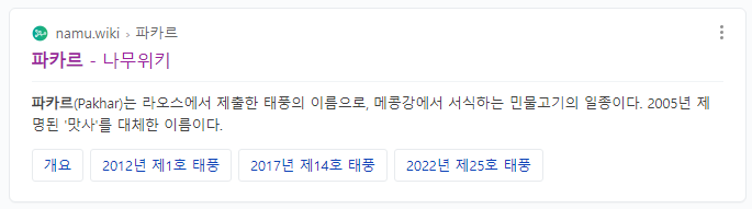'파카르'는 2005년 라오스에서 태풍위원회에 제출한 이름으로서 2005년 8월에 중국에서 29 명의 사망자를 냈던 태풍 '맛사'를 대체하는 이름입니다. 다른 블로그나 위키 등에서는 아주 짤막하게 '메콩강에 서식하는 민물고기의 일종'이라고만 설명하고 있는데요.