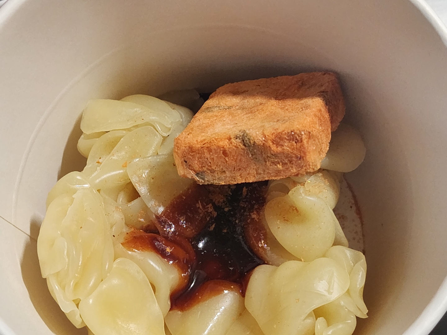 - 용기에 수제비, 액상스프, 건더기 블럭을 넣은 후 내부 물선까지 뜨거운 물을 부어줍니다.