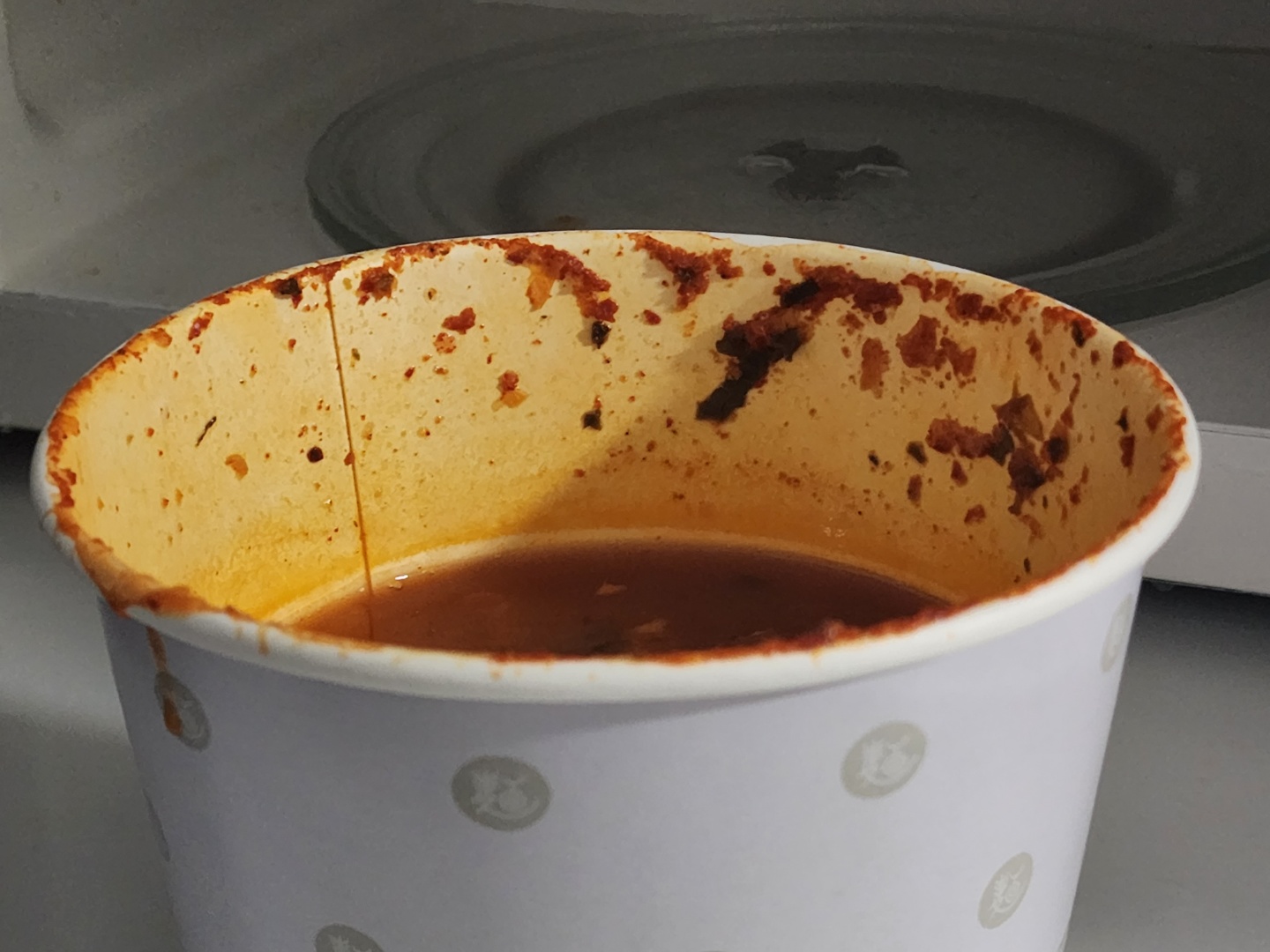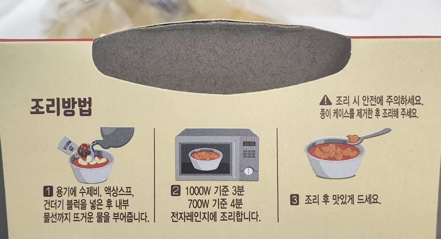 하지만 이 조리법에는 분명히 문제가 있습니다!!!! 분명히 물의 양과 시간을 준수하여 전자레인지에 돌렸건만.... 국물과 건더기는 거의 넘쳐 흐르기 직전까지 갔고, 넘치진 않았지만 전자레인지 벽면에 국물이 튀어 엉망이 되어 버렸습니다. 아... 진짜 정 안 가는 제품입니다. 제품 개발자 바이든 날리면 좋겠네요.