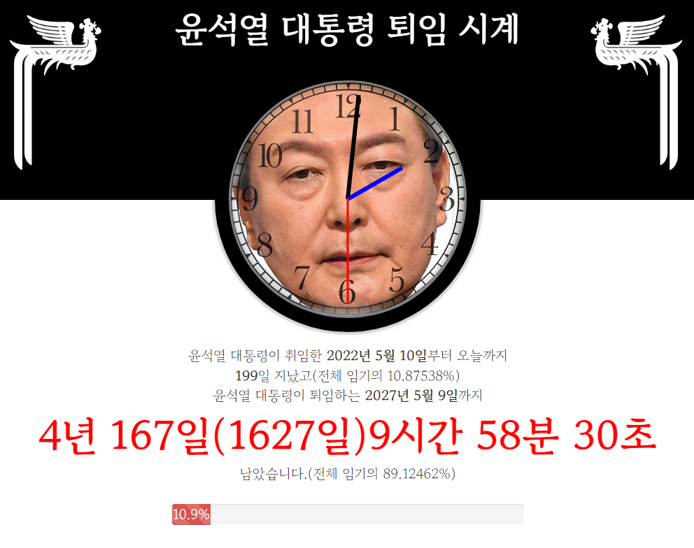 일전에 소개해드렸었는데, 오늘 접속해보니 한 단계 업그레이드 되었습니다. 윤석열 대통령 얼굴 위에 진짜 시계 바늘이 돌아가네요. ㅎㅎㅎ 엄청난 센스... 빵 터졌습니다.