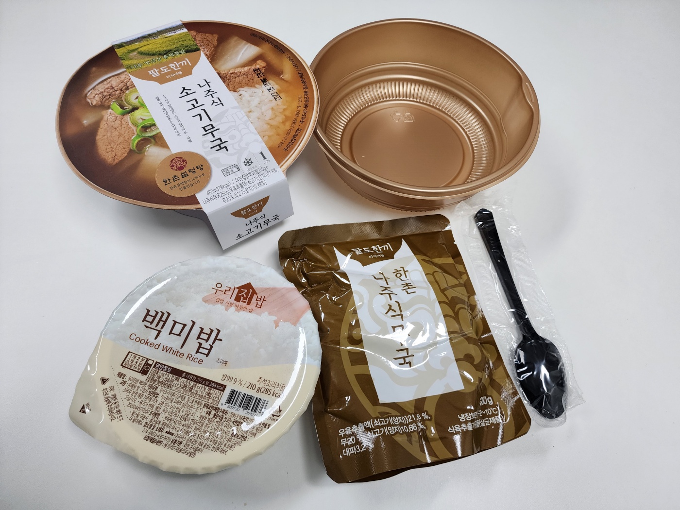 용기 안에 햇반 하나와 레토르트 파우치 하나.... 아주 단촐한 구성이네요. 쿠팡에서 CJ 비비고 소고기무국 파우치 제품이 1개당 3,000~3,600 원에 구매가 가능하므로 가격 대비 구성이 뜬금없지는 않은 것 같습니다.