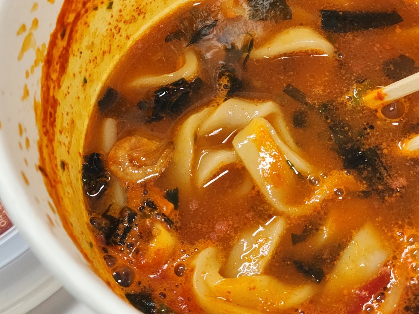특히 칭찬하고 싶은 부분은 건더기 블럭, 고명이라고 부르는 구성품인데요. 어지간한 짬뽕 제품의 건더기 블럭보다 더욱 풍성하고 화려한 맛을 느낄 수 있습니다. 제품의 메인 컨셉은 '딱새우'지만, 이 건더기 중에서 가장 존재감을 뿜어내는 것은 '오징어'입니다. 건더기 블럭 수준에 들어갈 레벨이 아닌 수준급 오징어 조각들이 몇 개 들어 있어요. 멸치잡이 그물에 다랑어가 혼획된 듯한 느낌? 이걸 씹고 있노라니 딱새우에 낚인 저의 한심함이 조금은 용서가 되더라구요.