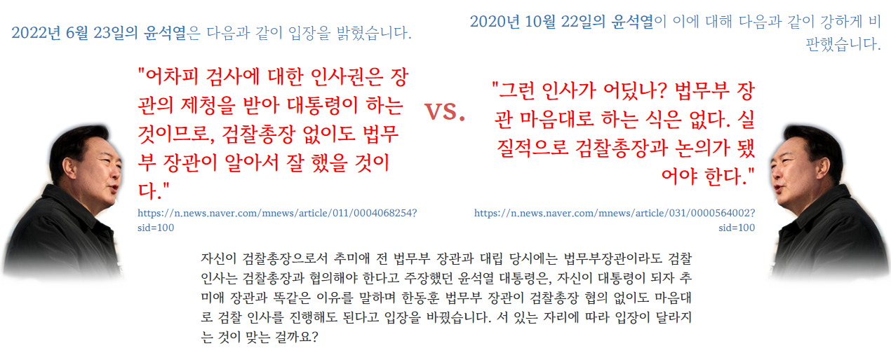 검찰총장 협의 없이 법무부장관 단독 혹은 독단적 인사에 대해서도 2022년 6월 23일의 윤석열 대통령은 '문제 없다'고 말한 반면, 검찰총장 시절이던 2020년에는 "그런 인사가 어딨냐"며 강하게 반발했습니다.