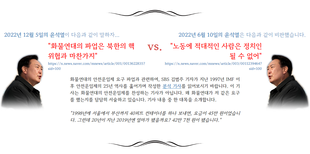 예를 들어, 윤 대통령은 2022년 12월 5일에 "화물연대의 파업은 북한의 핵 위협과 마찬가지" 라고 일갈한 적이 있는데요. 역설적으로 6개월 전인 2022년 6월 10일에 윤 대통령은 "노동에 적대적인 사람은 정치인이 될 수 없다"고 발언한 적이 있습니다. 노동에 적대적인 자신을 스스로 비판한 셈이 되었습니다.