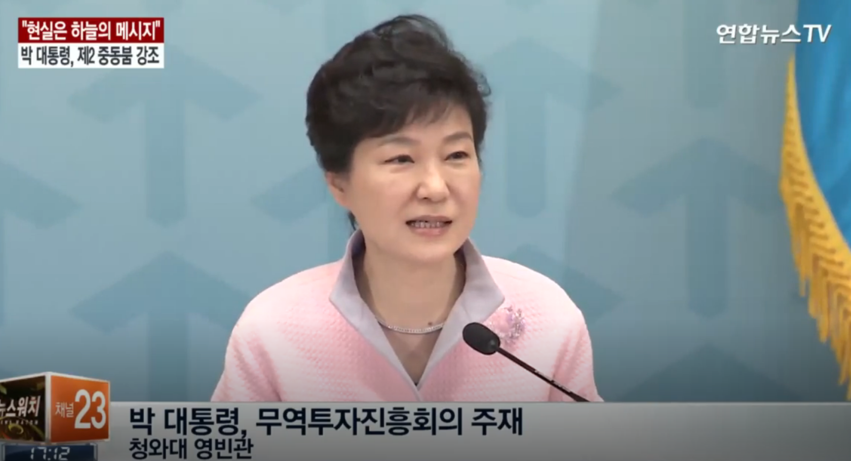 박 대통령은 무역투자진흥회의 모두발언에서 쿠웨이트와 사우디아라비아, 아랍에미리트(UAE), 카타르 중동 순방에서 "신성장 고부가가치 산업 분야에서 긴밀하게 협력을 하기로 했고, 현장에서 우리 기업들이 많은 계약을 체결했다"고 밝혔습니다. 그리고 순방성과를 바탕으로 제2 중동붐을 일으켜 경제 재도약의 계기로 삼아야 한다며 이를 "현실이 주는 하늘의 메시지"라고 강조했습니다. (뉴스 출처 : 연합뉴스TV)