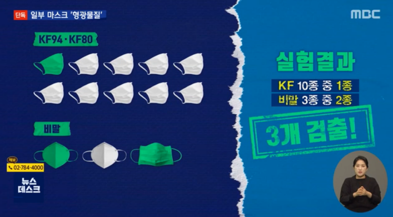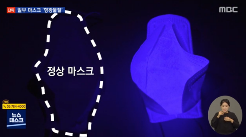 언론에서도 이 문제를 취재했는데 적지 않은 제품들에 형광물질이 사용된 것이 확인되었습니다. 참고로 아래는 MBC 보도 내용입니다.